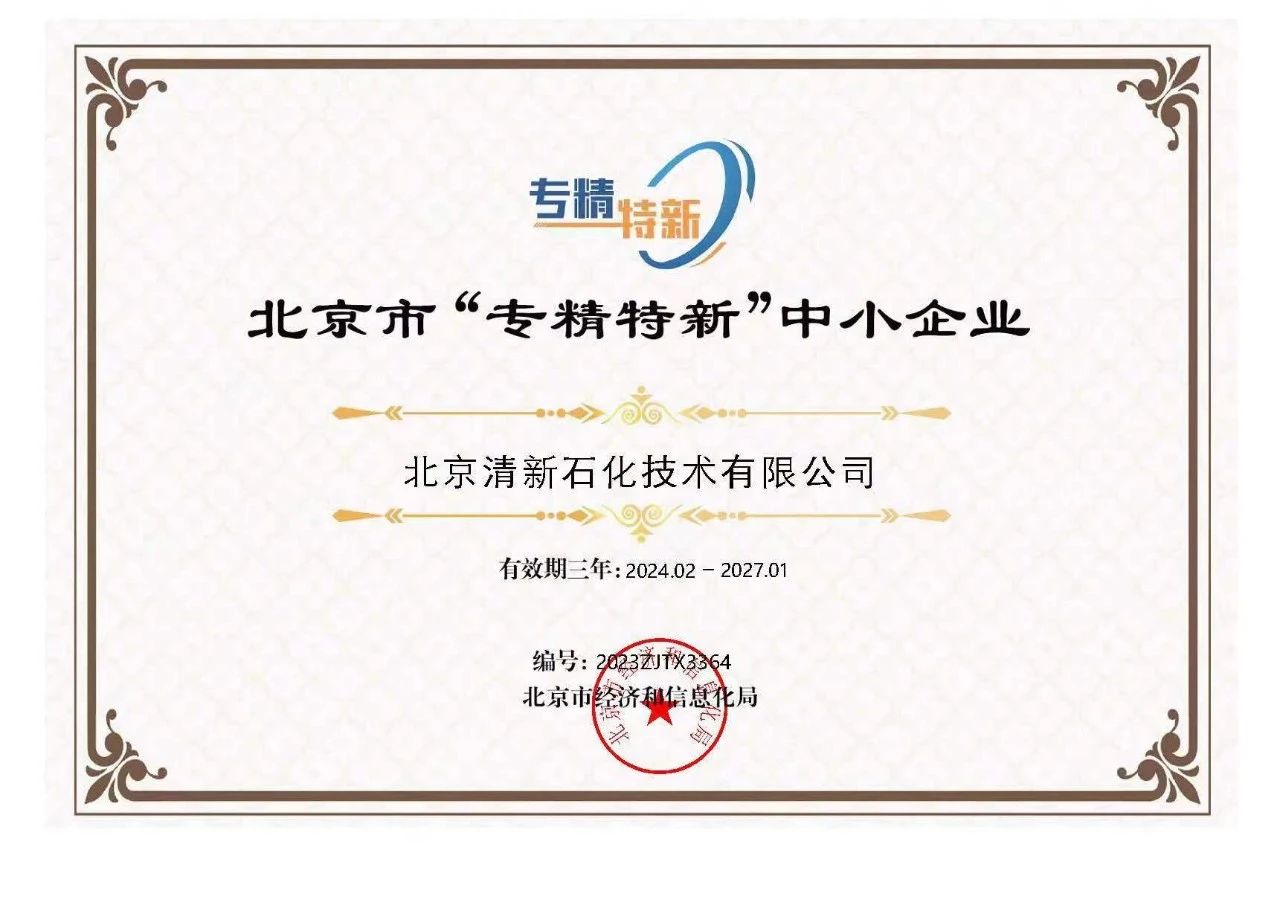 近日,北(běi)京市經濟和信息化局發布了《關於對2023年(nián)第四季度北京市專精特新中小企業名單進行公告的通知》,羞羞视频网址環境子公司北京清(qīng)新石(shí)化(huà)技術有限公(gōng)司(以(yǐ)下簡稱“羞羞视频网址石化”)獲得北京市“專精特新”中小企業稱號。